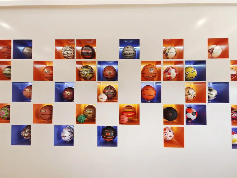 No showroom de produtos da Meidong Sports, existem dezenas de produtos de basquete, futebol e vôlei de diferentes estilos e cores brilhantes.