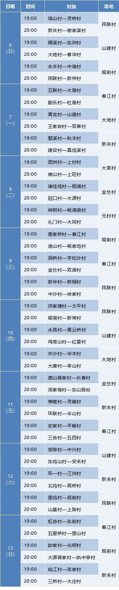 A competição foi realizada em nove zonas de competição: Minlian Village no subdistrito de Dongzhou; Vila Dadi, vila de Jinzhu e vila de Guanqian (Zhougongwu) no subdistrito de Yinhu; Vila de Chunjiang e vila Shanjian no subdistrito de Chunjiang; Vila de Yuan na cidade de Xindeng; o salão de basquete da cidade de Changlv; e Xinguan Village em Dayuan Town . Este ano, ainda mais pessoas poderão assistir aos jogos emocionantes à sua porta.